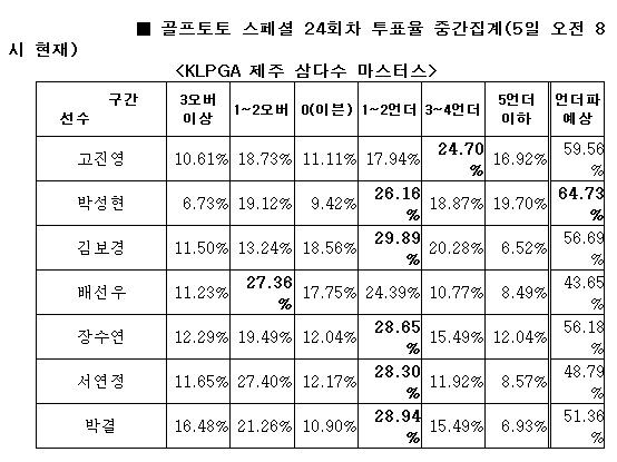 한편, 1번으로 지정된 고진영(59.56%)을 포함해 3번 김보경(56.69%), 5번 장수연(56.18%), 7번 박결(51.36%)이 과반수의 언더파 예상 투표율을 넘기며 그 뒤를 이었다.