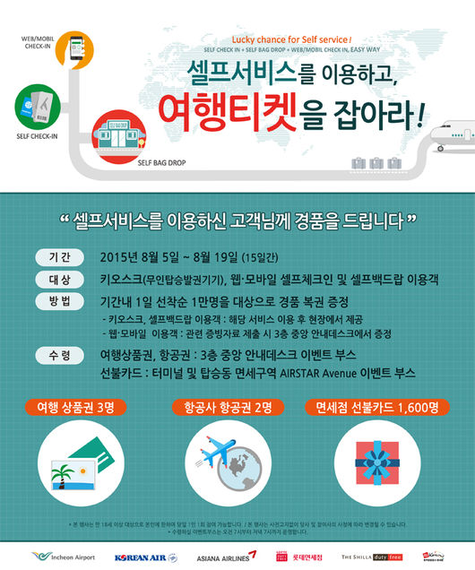 인천공항공사와 아시아나항공, 대한항공, 롯데면세점, 신라면세점, 한국관광공사가 함께 진행하는 이번 이벤트는 5일부터 19일까지 2주 동안 진행된다. 웹·모바일 체크인 또는 셀프체크인, 자동수하물위탁(셀프백드롭) 서비스를 이용하는 여객 중 매일 선착순 1만 명에게 경품 복권이 제공된다. 셀프체크인과 자동수하물위탁 기기를 이용하는 여객은 현장에서, 웹·모바일 체크인 이용객은 3층 중앙 안내데스크에서 경품 복권을 받을 수 있다.