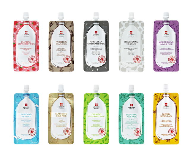 리더스 메디유 워시오프 팩 10종은 여름철 피부 고민에 알맞은 모공청정 탄산팩, 촉촉수딩 알로에 팩을 비롯해 탱탱탄력 황금 팩, 퓨리파잉 솔트 팩, 매끈각질 딸기 팩, 수분가득 자스민 팩, 영양듬뿍 곡물 팩, 뽀얀피부 우유 팩, 윤기반짝 벌꿀 팩, 쿨링진정 페퍼민트 팩 등 독특한 네이밍으로 제품타입을 손쉽게 알 수 있다.