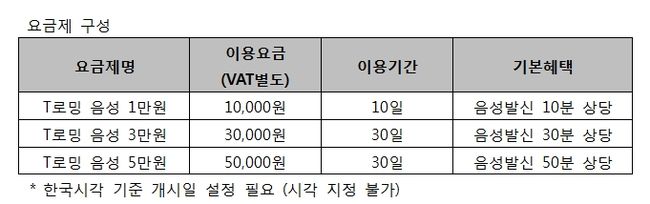 'T로밍 음성 1/3/5만원' 요금제는 여행객이 정해진 기간 동안 한국발신, 국제발신, 현지발신 등 로밍 음성발신을 할인된 요금으로 이용할 수 있는 서비스다. 여행객은 요금제에 따라 10일/30일간 10분/30분/50분 상당에 해당하는 로밍 음성발신을 이용할 수 있다. 요금은 10분/30분/50분 상품이 각각 1만원/3만원/5만원(VAT별도)에 제공된다.