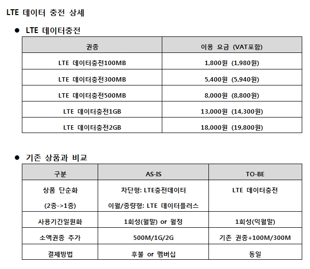 또한, 기존 데이터 충전 부가서비스는 500MB, 1GB, 2GB의 3종만 있어, 소량 충전을 원할 경우 권종의 선택이 어려웠던 반면, 새로 출시된 'LTE 데이터충전'은 100MB부터 2GB까지 총 5종을 제공하여 데이터 충전량에 대한 소비자 선택의 폭을 확대했다. 한 달에 최대 30회까지 중복으로 충전할 수 있다.
