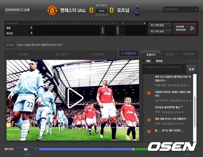 다음 스포츠가 다음tv팟과 카카오TV에서 EPL 경기를 실시간으로 중계한다.