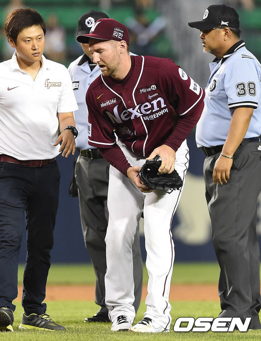 초반 실책에 흔들린 라이언 피어밴드(30, 넥센 히어로즈)가 타구에 맞고 교체됐다.