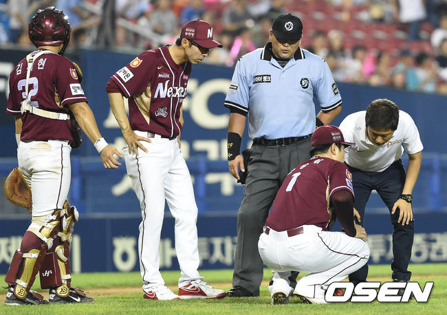 7일 오후 서울 잠실구장에서 열린 '2015 타이어뱅크 KBO 리그' 두산 베어스와 넥센 히어로즈의 경기 8회말 1사 만루 양의지의 내야안타 타구에 맞은 손승락이 고통을 호소하고 있다.