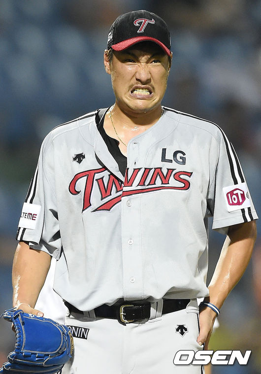 7일 오후 대전 한화생명 이글스 파크에서 열린 '2015 타이어뱅크 KBO 리그' 한화 이글스와 LG 트윈스의 경기, 8회말 한화 선두타자 정현석 타구에 손을 맞은 LG 이동현이 고통을 호소한 후 시험 투구를 해보려 하지만 고통을 호소하고 있다. 이후 봉중근과 교체됐다.