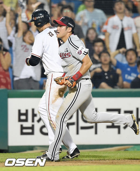 그러나 5-6으로 뒤진 10회말 2사 1, 2루에서 강경학의 내야안타에 2루 주자 김회성이 3루서 오버런해 허무하게 경기가 끝났다. 상황은 이랬다. 강경학의 타구를 LG 유격수 오지환이 캐치, 오지환은 즉시 1루로 던져 타자 주자 포스아웃을 생각했다. 그러나 글러브에서 한 번에 공을 빼지 못해 내야안타가 됐다.