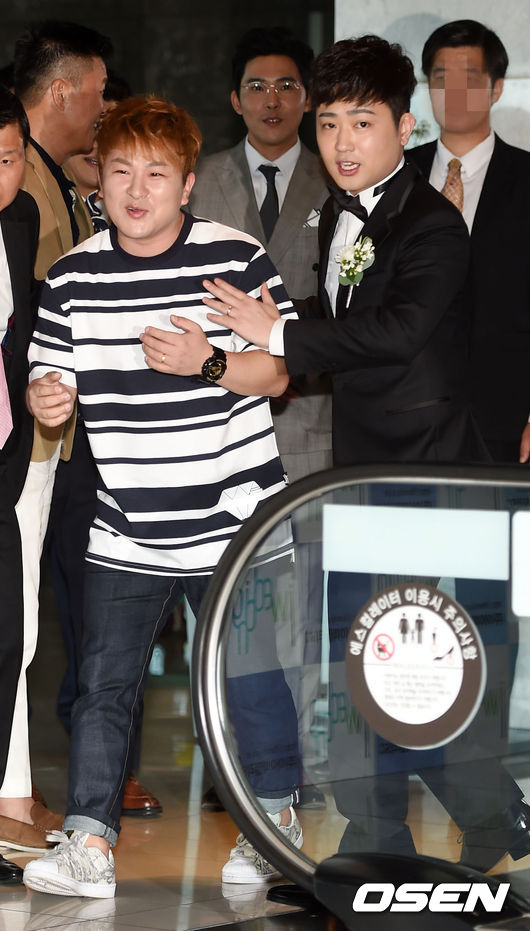 8일 오전 서울 광진구 광장동 워커힐호텔 비스타홀 앞에서 진행된 가수 박현빈 결혼식 전 포토타임에서 박현빈이 직접 허각을 데리고 나오고 있다.
