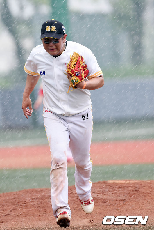 2회말 부산 이수화학 신윤범이 우천으로 경기가 중단되자 더그아웃으로 들어가고 있다.