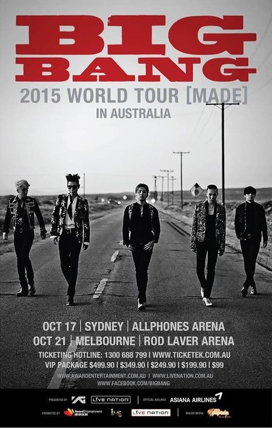 오는 10일 오전 10시(현지시각)에 10월 17일과 21일 각각 호주 시드니 올림픽 공원 올폰 아레나(SYDNEY OLYMPIC PARK – ALLPHONES ARENA)와 멜버른 호주오픈 주 경기장(ROD LAVER ARENA)에서 개최되는 빅뱅 월드투어 호주 공연 티켓 예매가 시작된다.