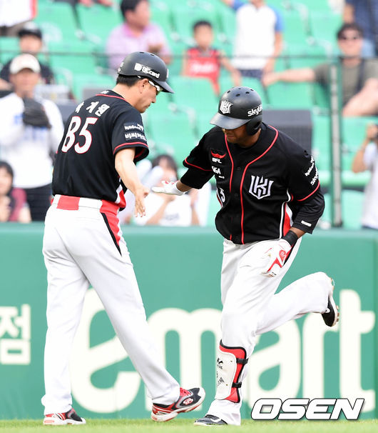 1회초 1사 1루 kt 마르테가 투런을 치고 박계원 코치와 기쁨을 나누고 있다.