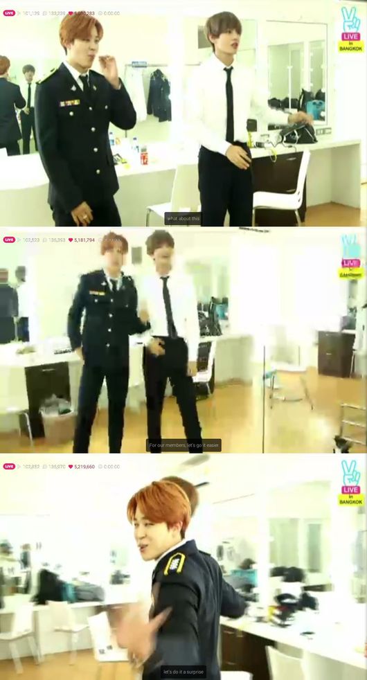 지민과 뷔는 8일 오후 V앱을 통해 생중계된 태국 콘서트 백스테이지 라이브 'BTS in Thailand with V'에서 '흥탄소년단' 공연을 보여주겠다며 카메라 앞에서 안무를 짰다.