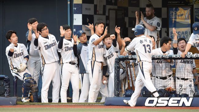 2회말 NC 공격 1사 주자없는 상황 손시헌이 좌월 솔로포를 날리고 더그아웃 동료들과 인사를 나누고 있다.