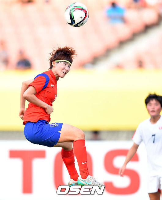 8일 오후(현지시간) 중국 우한 스포츠센터 스타디움에서 열린 '2015 동아시안컵' 여자축구 한국과 북한의 경기, 전반 임선주가 헤딩슛을 시도하고 있다.