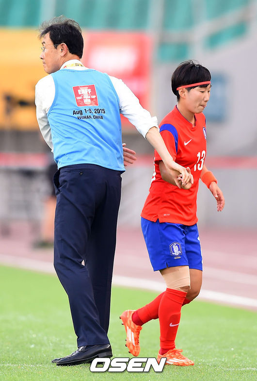 8일 오후(현지시간) 중국 우한 스포츠센터 스타디움에서 열린 '2015 동아시안컵' 여자축구 한국과 북한의 경기, 후반 권하늘이 교체되며 윤덕여 감독의 독려를 받고 있다.