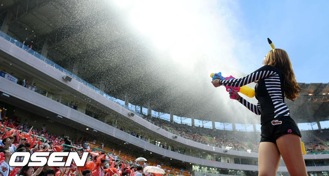 4회말 이닝종료후 관중석을 향해 물세례 이벤트가 진행되고 있다.