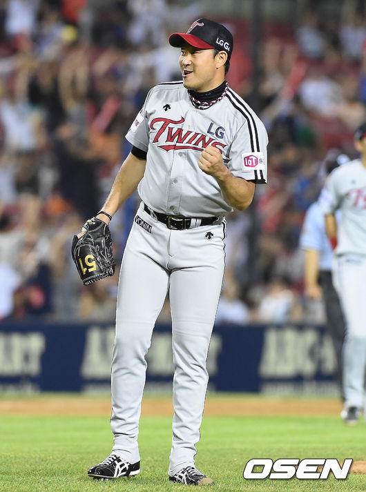 8일 오후 서울 잠실구장에서 열린 '2015 타이어뱅크 KBO 리그' 두산 베어스와 LG 트윈스의 경기 9회말 2사 민병헌을 내야땅볼로 잡은 봉중근이 기뻐하고 있다.