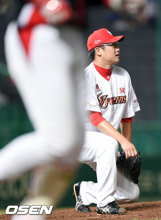 9회초 무사 1루 SK 전유수가 kt 김상현에게 볼넷을 허용하자 무릎을 꿇고 있다.