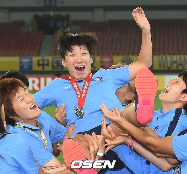 시상식 후 A매치 100경기 출전 대기록 달성한 권하늘이 헹가래를 받고 있다. / soul1014@osen.co.kr