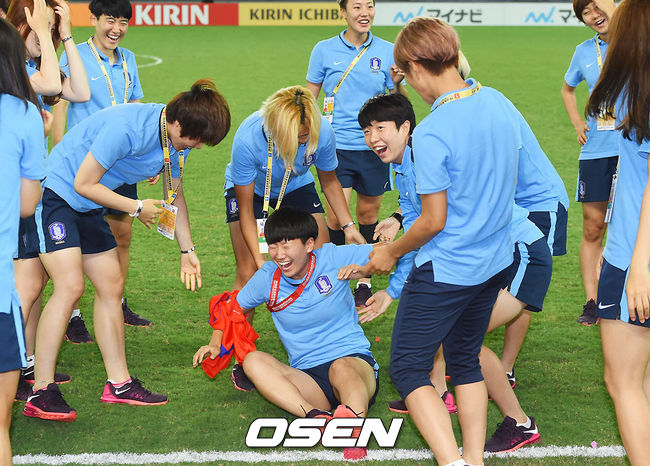 시상식 후 A매치 100경기 출전 대기록 달성한 권하늘이 헹가래를 받고 있다. / soul1014@osen.co.kr