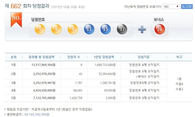 [OSEN=이슈팀] 로또 제 662회차 당첨번호가 5, 6, 9, 11, 15, 37로 정해졌다. 8일 저녁 추첨한 로또 666회차에서는 이 같은 당첨 번호 외에 26번의 보너스 번호도 뽑았다.
