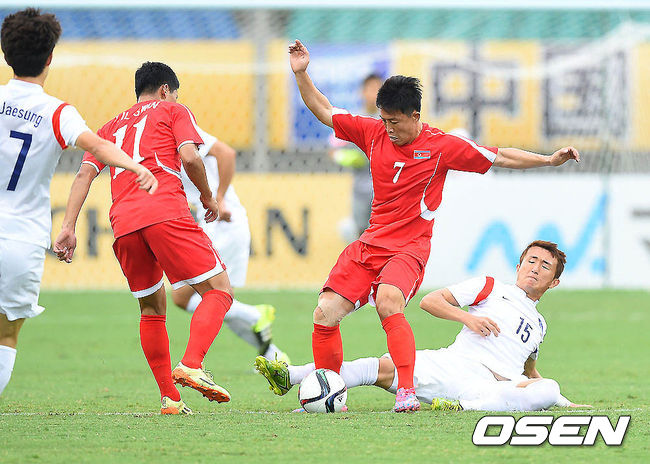 9일 오후(현지시간) 중국 우한 스포츠센터 스타디움에서 열린 '2015 동아시안컵' 남자축구 한국과 북한의 경기, 전반 임창우가 북한 리혁철을 태클로 막고 있다.
