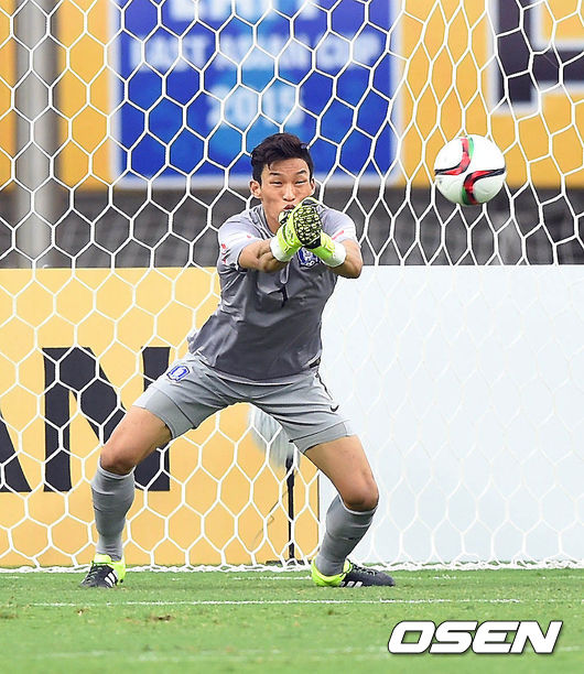 9일 오후(현지시간) 중국 우한 스포츠센터 스타디움에서 열린 '2015 동아시안컵' 남자축구 한국과 북한의 경기, 김승규가 북한의 중거리 슈팅을 펀칭으로 걷어내고 있다.
