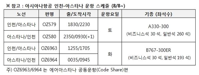 아시아나가 주1회 운항하는 인천~아스타나 노선은 오후6시 30분(한국시각) 인천공항을 출발해 오후 10시 30분(현지시각) 아스타나공항에 도착하며, 아스타나에서는 오후 11시 50분(현지시각) 출발해 다음날 오전 9시 30분(한국시각) 인천공항에 도착한다.