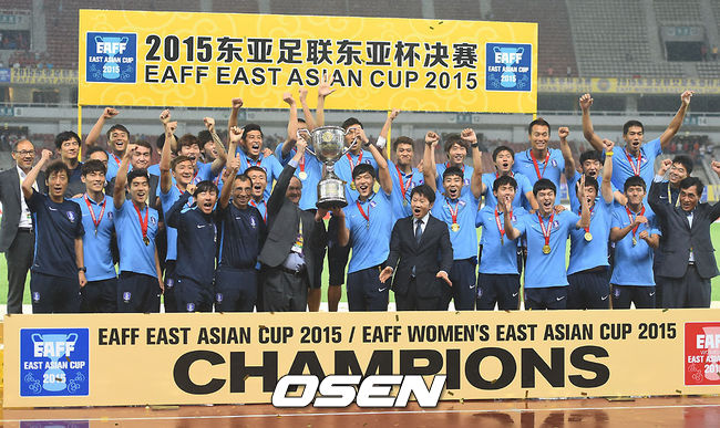 울리 슈틸리케(61) 감독이 이끄는 남자 축구대표팀은 9일(한국시간) 중국 우한 스포츠센터 스타디움서 끝난 2015 동아시아축구연맹(EAFF) 동아시안컵서 정상에 올랐다. 1승 2무(승점 5)를 기록한 한국은 중국과 북한(이상 승점 4), 일본(승점 2)을 따돌리고 2008년 이후 7년 만에 대회 우승컵을 들어올렸다.