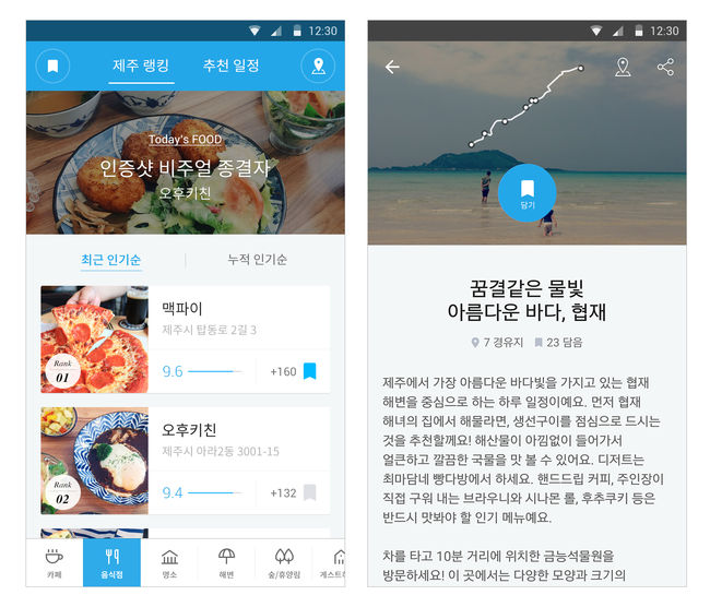 제주의 핫플레이스만 여행하고 싶다면, 트래블라인이 추천하는 일정을 참고해도 좋다. ‘추천 일정’ 메뉴에서는 인기 장소를 테마별로 구성해 추천하는 큐레이션 서비스를 제공한다. 아이가 있는 가족에게 추천하는 일정, 연인이 달콤한 추억을 쌓을 수 있는 일정, 레저 활동으로 이루어진 일정 등 다양한 테마를 이용자가 자신의 기호에 맞게 선택해 여행을 즐길 수 있다.