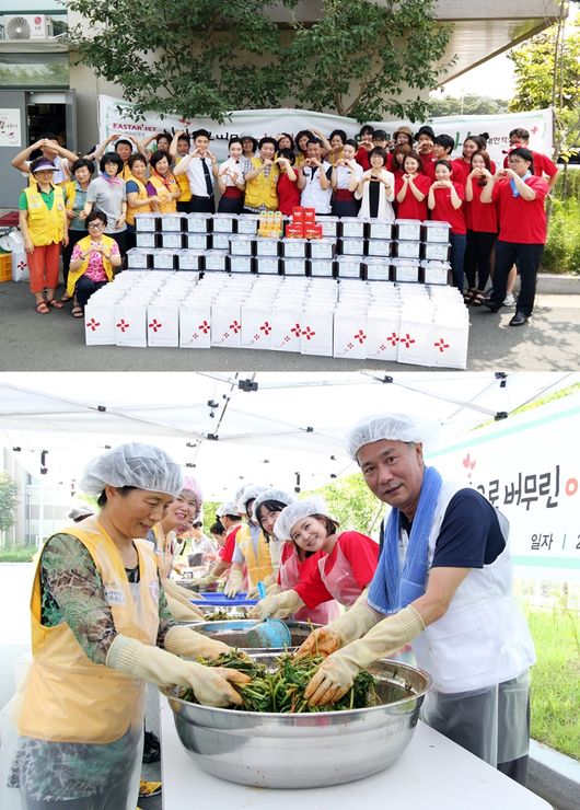 8일 오후 전주시 대한적십자사 전북지사 행사장에서 이스타항공 임직원과 적십자사 자원봉사원들이 전주시 거주 저소득 노인 가구에 열무김치를 전달하기 전 기념 촬영을 하고 있다. 아래는 대한적십자사 전북지사가 행사장에서 이스타항공 임직원들과 적십자사 자원봉사원들이 전주시 거주 저소득 노인 가구에 전달할 열무김치를 버무리고 있는 모습.