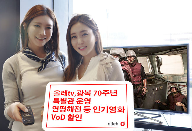 KT의 IPTV 서비스 올레tv는 광복 70주년 특별관을 14~16일 운영한다. 올해 상반기 최고 흥행작 '연평해전' VoD는 60% 저렴하게 내놓고, 14~15일 양일간 구매자 전원에게 100% 페이백해 준다. 최신작 '차이나타운' 등 70여 편은 무료로 내놓고, 평생소장이 가능한 클라우드DVD 역대 인기영화 100편은 평소보다 30% 할인한다.