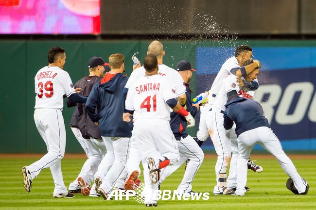양키스전에서 끝내기 안타를 친 뒤 환호하는 클리블랜드 선수들. ⓒ AFPBBNews = News1
