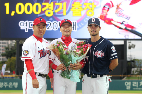 KIA타이거즈 외야수 김원섭이 12일 광주 두산전에 앞서 1000경기 출장 달성 시상식을 가졌다.