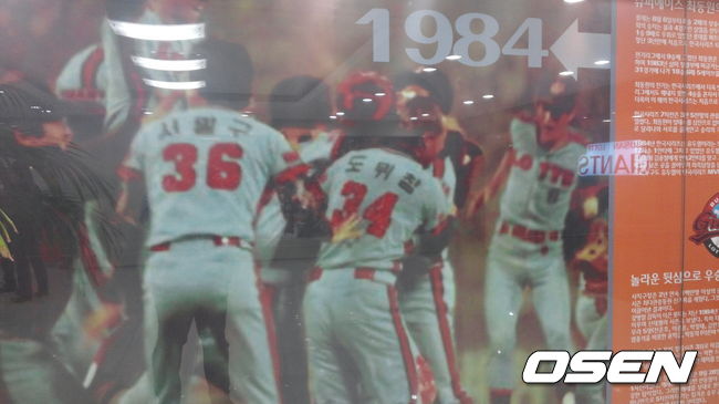 사직구장 정문 앞에 있는 1984년 우승 당시의 사진. 1군 출전경험은 없는 서말구였지만, '36번'이라는 배번이 눈에 띈다.