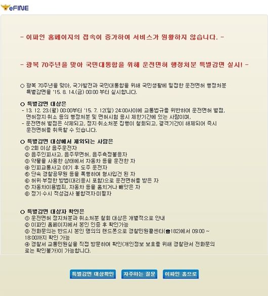 이번 특별감면 대상자 확인은 이파인 홈페이지(http://www.efine.go.kr) 또는 경찰민원콜센터(182)에서 확인할 수 있다. /osenlife@osen.co.kr