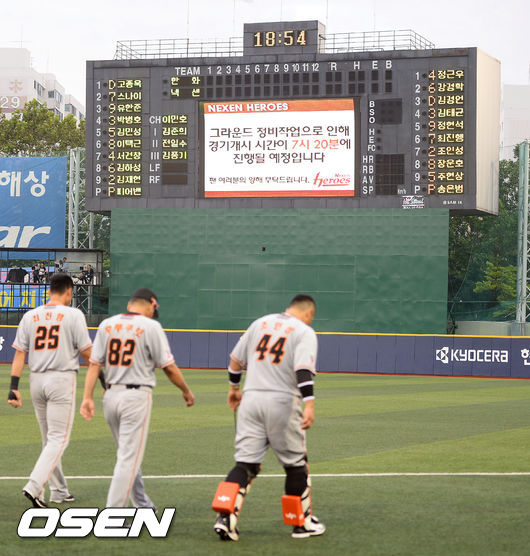 한국야구위원회(KBO)는 13일 목동구장에서 열리는 '2015 타이어뱅크 KBO 리그' 한화 이글스-넥센 히어로즈전이 오후 5시 쯤부터 강한 비로 인해 젖은 그라운드를 정비하기 위해 오후 7시 20분에 시작한다고 밝혔다. 애초 7시로 미뤄졌다가 다시 연장됐다.