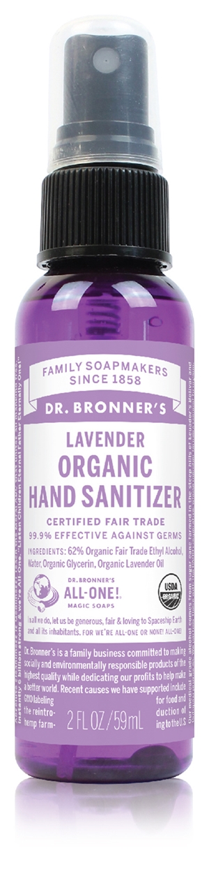 닥터 브로너스의 '라벤더 오가닉 핸드 새니타이저'는 100% 유기농 성분으로 만들어 합성화학성분이 손에 남지 않으며, 대장균과 황색포도상구균 등 손에 많이 서식하는 유해세균을 30초 이내 99.9% 제거한다. 에콰도르의 유기농 사탕수수에서 추출한 알코올이 살균 효과를 제공하며 자연의 향 그대로인 유기농 라벤더 오일이 피부 진정에 도움을 준다. 특히 라벤더 에센셜 오일은 몸과 마음을 편안하게 만들어 숙면을 유도하며 여름철에는 모기퇴치 효과도 있다.