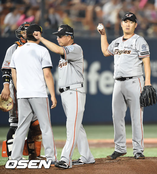 13일 오후 오후 목동 야구장에서 열린 '2015 타이어뱅크 KBO 리그' 넥센 히어로즈와 한화 이글스 경기, 3회말 1사 주자 2루 넥센 이택근 타석에서 한화 선발 송은범이 강판당하고 있다.