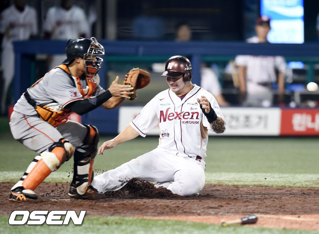 13일 오후 오후 목동 야구장에서 열린 '2015 타이어뱅크 KBO 리그' 넥센 히어로즈와 한화 이글스 경기, 5회말 2사 주자 2루 넥센 서건창이 1타점 적시타때 2루 주자 박병호가 홈으로 몸을 날려 세이프 되고 있다.