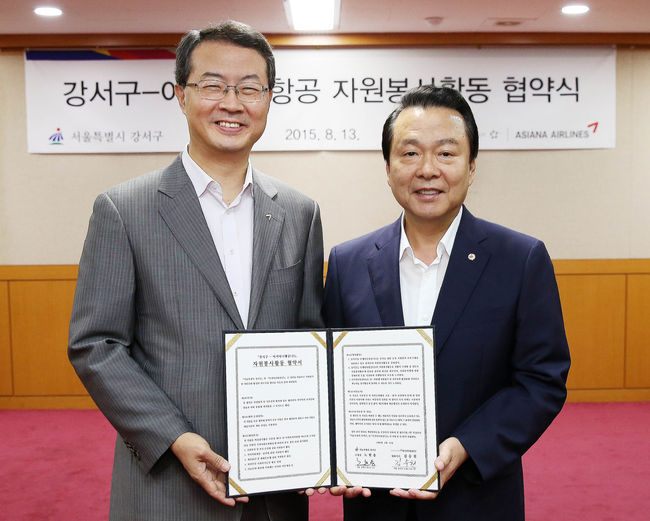아시아나항공(대표 김수천)은 13일 서울시 강서구청에서 강서구(구청장 노현송)와 '자원봉사 활동 협약식'을 체결하고 강서구 내 사회공헌 활동을 강화한다.