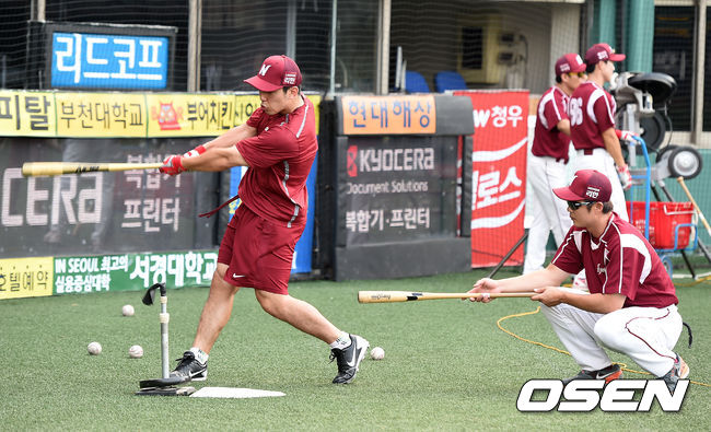 경기에 앞서 넥센 서건창이 강병식 코치의 지도아래 타격 훈련을 하고 있다.