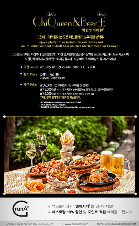 노보텔 앰배서더 강남은 국민 야식인 '치맥'을 앞세웠다. 자사 엔터테인먼트 바인 그랑아 Ⅱ에서 치킨과 맥주를 무제한으로 제공하는 '그랑아 Ⅱ 치맥 바캉스, 치퀸&비어왕'을 준비한 것.