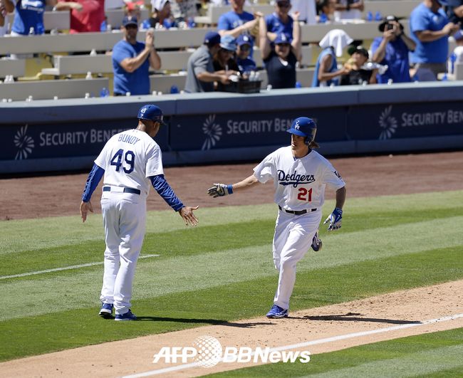 다음 타자는 그레인키. 신시내티 선발 데스칼라파니의 초구 직구(94마일)가 들어오자 그레인키의 배트도 날카롭게 돌았다. 관중들의 함성 속에서 타구는 피더슨의 타구가 날았던 궤적을 거의 그대로 따라갔다. 경기를 역전시키는 시즌 2호째 홈런. 다저스 투수가 한 시즌에 2홈런 이상을 기록한 것은 2000년 대런 드라이포드(3개), 박찬호(2개)가 마지막 이었다.