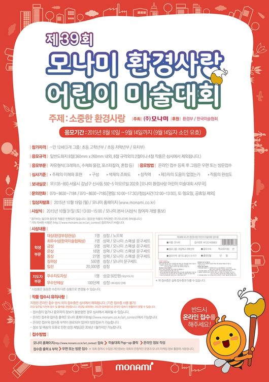 대상에는 환경부 장관상, 최우수상에는 한국미술협회상이 주어지며 금상, 은상, 동상을 포함해 총 2만 556명의 입상자가 선정된다. 수상자는 오는 10월 19일 모나미 미술대회 공식 홈페이지(www.monami.co.kr/art_contest)통해 발표된다. 어린이부문 외에 우수지도자상과 우수단체상 등 지도자부문 시상도 진행된다. /letmeout@osen.co.kr