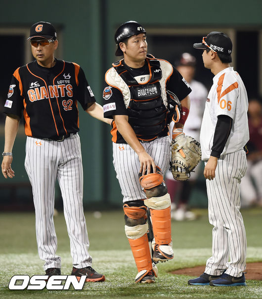 롯데 자이언츠 안방마님 강민호가 경기 초반 교체됐다.