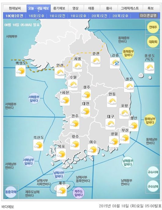 오늘의 날씨예보를 보여주는 기상청 홈페이지 캡처.