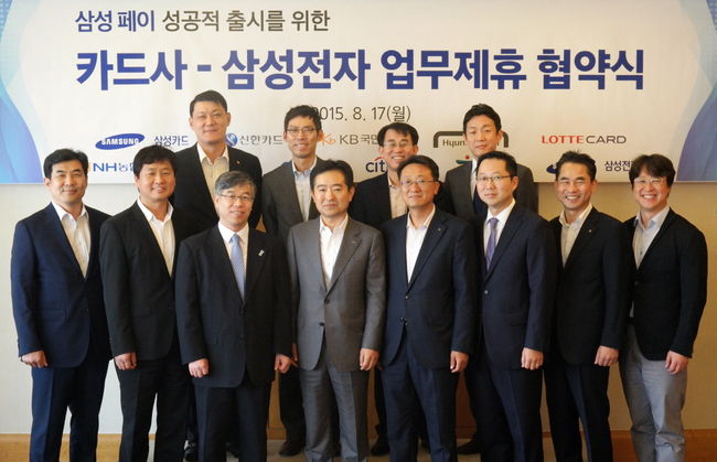 삼성전자는 삼성카드, 신한카드, KB국민카드, 현대카드, 롯데카드, NH농협카드, BC카드, 하나카드, 우리카드, 씨티은행 등 국내 10개 카드사와 한 자리에 모여 '삼성 페이' 준비 현황을 점검하고 출시 후 서비스 본격 활성화를 위한 상호 지원 방안을 협의했다.