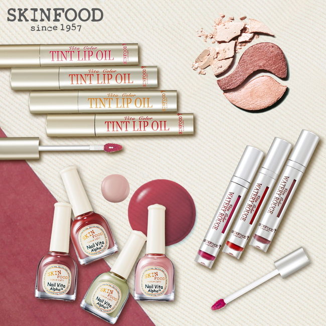 스킨푸드 ‘비터 스윗 마르살라 컬렉션’은 신제품 ‘비타 컬러 틴트 립 오일’을 비롯, 마르살라 계열의 새로운 색상으로 추가 출시된 ‘비타 컬러 워터리 루즈’, ‘미네랄 슈가 트리플 섀도’, ‘네일비타 알파∝ 마르살라 네일’ 등 4가지 제품으로 구성됐다.