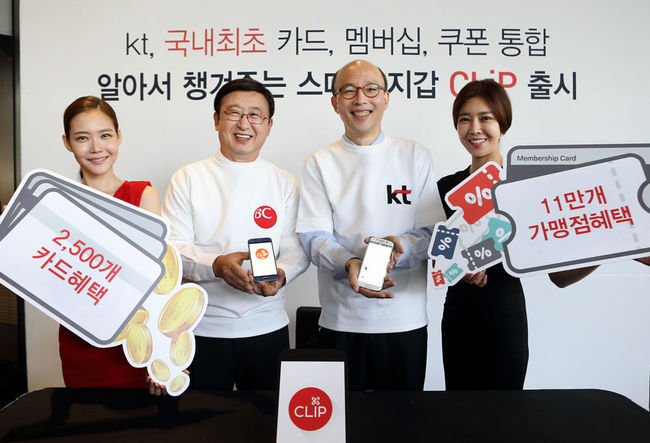 KT(회장 황창규, www.kt.com)와 BC카드(사장 서준희)는 18일 광화문 KT West 사옥에서 기자 간담회를 열고 카드 할인 정보와 멤버십, 쿠폰을 엮어 이용자가 챙길 수 있는 최대 할인 혜택을 자동으로 알려주는 모바일 지갑 서비스 '클립(CLiP)'을 출시한다고 밝혔다. 이용자별 신용·체크카드 할인정보와 멤버십 등 통합 혜택을 맞춤형으로 제시하는 것은 최초이다.