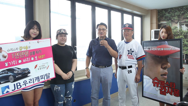 인생역경을 이겨내고 영화의 주인공까지 된 프로야구 통산 1승의 주인공, 삼미슈퍼스타 투수 감사용이 지난 9일 모처럼 마산야구장에 등장했다. 스포츠 경품 앱 ‘스타디움’이 주관하고 JB우리캐피탈이 주최한 “3,000만 원 상품타기 가위바위보” 이벤트의 당첨자인 김도경 씨와 슈퍼스타 감사용이 1000만원 상당의 ‘렌터카’ 상품을 걸고 가위바위보 게임을 펼치기 위해서였다.